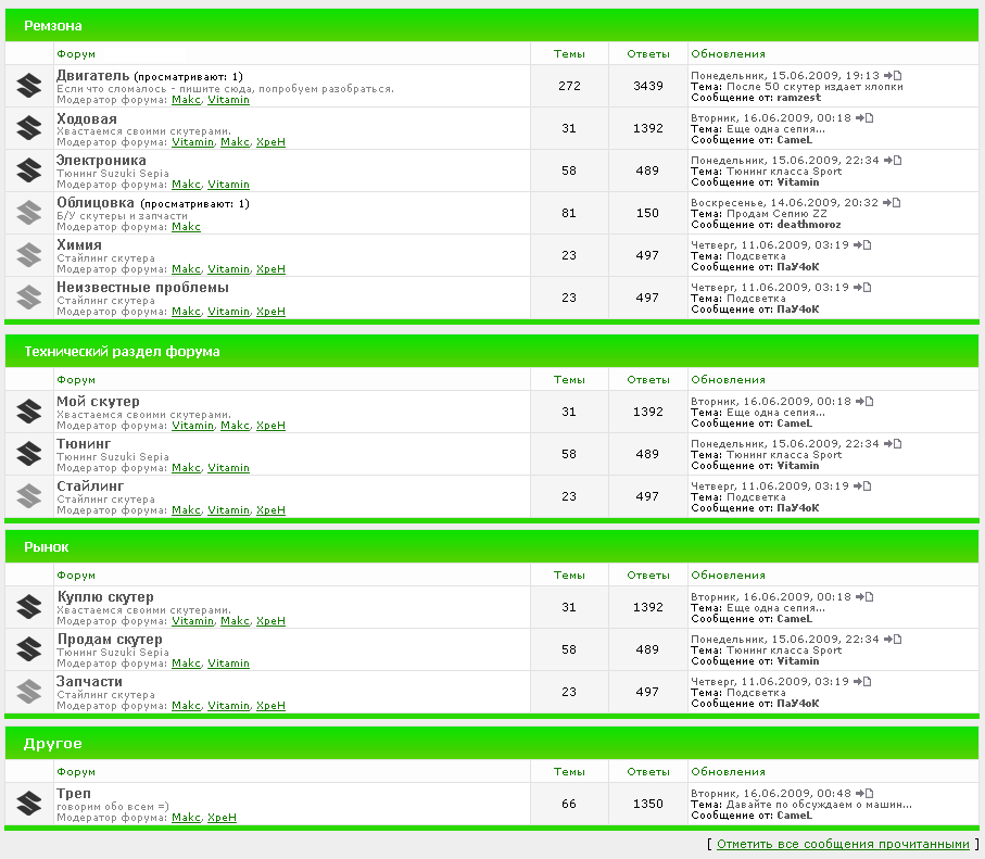 guf_22rus, в темах много не по теме...--- ну конечто ктото из новеньких заходит и задает вапрос и тема уже меняються не будут же его игнорировать и продолжать разговаривать!!!! bismarck, так что над придумать структуру...обсудить здесь и к месной власти с предложением Сейчас чтот прикину и выложу.. Добавлено (11.06.2009, 12:31) --------------------------------------------- Технический раздел по sepia : -Двигатель -Электрика -Ходовая -Облицовка -Химия Технический раздел по другим скутерам: И в етом разделе можно уже просто все подряд и электрику и ходовую..... а все остальное или без изменения или тож что т придумать пока идей нет...--- знаешь еще как можно зделать например! -Двигатель --- заходим и там уже разделы о вариаторах о поршне о цпг о там о карбюраторе и в других также а если например -ХОДОВАЯ - то просто написать ходовая задней части ходовая передней части ну вот так кто меня понил то поймет что я имею в виду!!! guf_22rus, я первый модер буду (из новых) --- без вапросов я за просто модермом может каждый стать но если они будут ответственами!!=)))